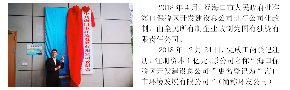??谑协h境發展有限公司是??谑袑賴歇氋Y有限責任公司,于2018年12月正式掛牌運營,注冊資本1億元,由1993年12月成立的海口保稅區開發建設總公司進行公司化改制而成,核心業務為環境環衛產業投資和運營、資產運營和管理,培育業務為工程管理